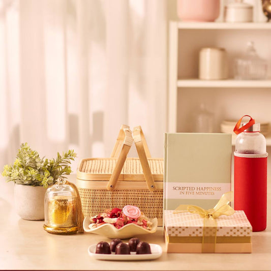 Creating a gratitude gift hamper is a wonderful way to express appreciation and thanks to someone special. In a work environment there are highs and lows and people who stick by you during tough times, must always be celebrated and gifting them the Gratitude Gift Hamper, is a great way you can try to do it. It contains An Indoor bloom plant, A Gratitude book, A Box of truffle chocolates, A Scented candle (vanilla), A keepsake Jute Book, and A gift card.