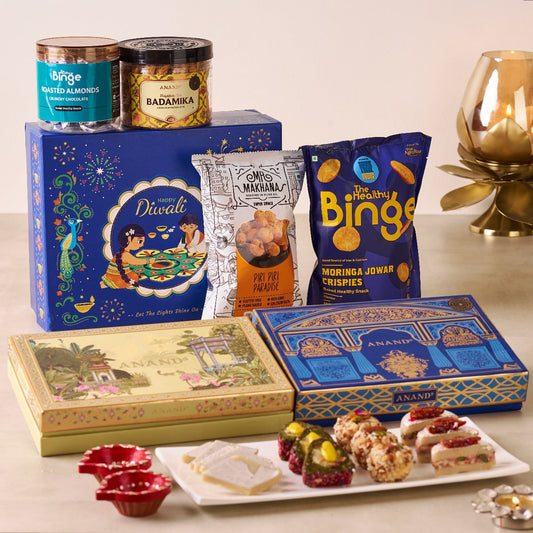 Timeless selections packed with Indian mithai, assorted dry fruits, decorative diyas, and aromatic incense These are perfect Diwali gifts for family and elders who value tradition.